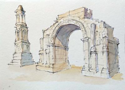 D'abord les antiques: l'arc de triomphe et le mausolée de Jules, en représentation rapide plume et couleur: